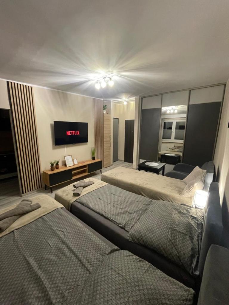Apartament typu studio. This apartment includes 1 bedroom, a kitchen and 1 bathroom with a shower and a hairdryer. Meals can be prepared in the well-fitted kitchen, which has a stovetop, a refrigerator, kitchenware and an oven. The apartment offers a washing machine, a coffee machine, a wardrobe, tumble dryer and a flat-screen TV. The unit has 4 beds. Apartament - 4 osobowy. Powierzchnia pokoju ok.: 25 mkw.